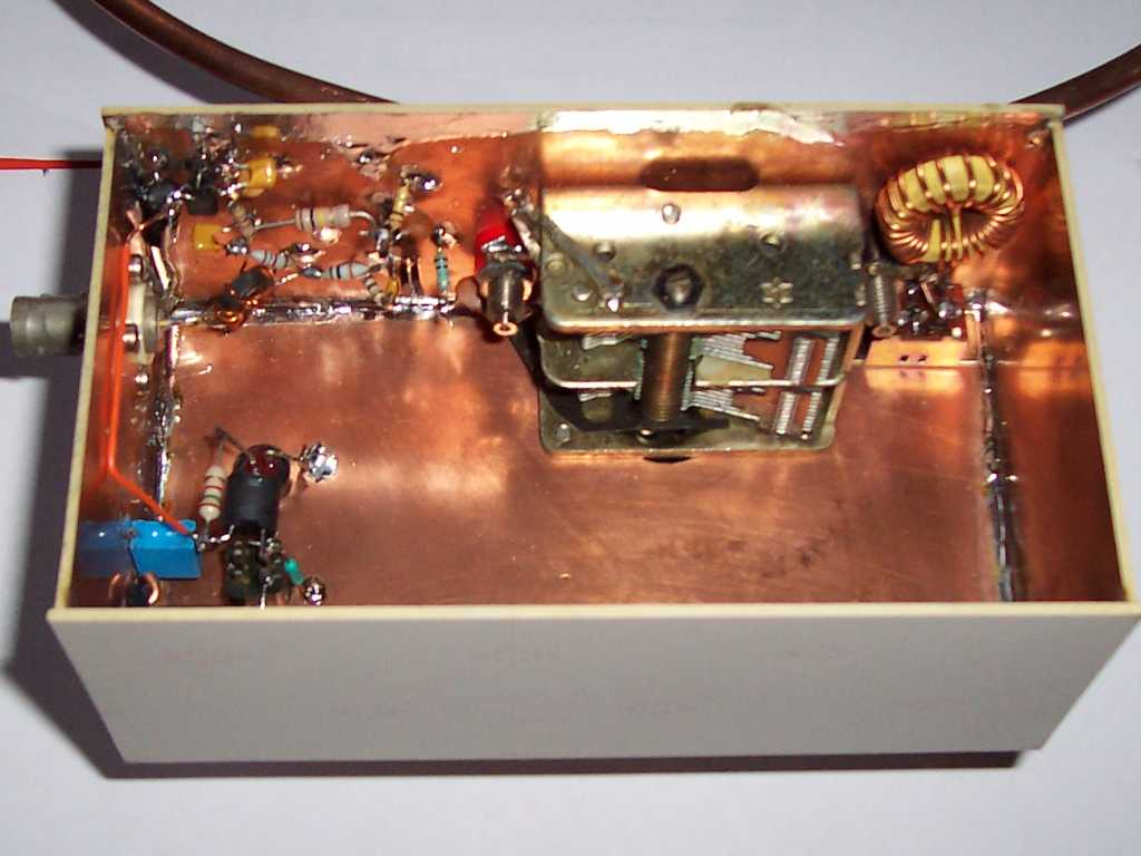 J'ai utilisé une boucle et une commutation pour obtenir l'ensemble des fréquences comprises entre 1,8 mHz et 30 mHz. J'ai utilisé les composants dormaient dans mes tiroirs. Le boitier est réalisé en simple face, cuivre à l'intérieur, sur lequel sont soudés les composants. Pas de gravures donc réalisation rapide. Le boucle est en tube de cuivre de 6 mm de diamètre avec des fiches bananes de 4 mm ce qui permet d'essayer différents types de boucles.