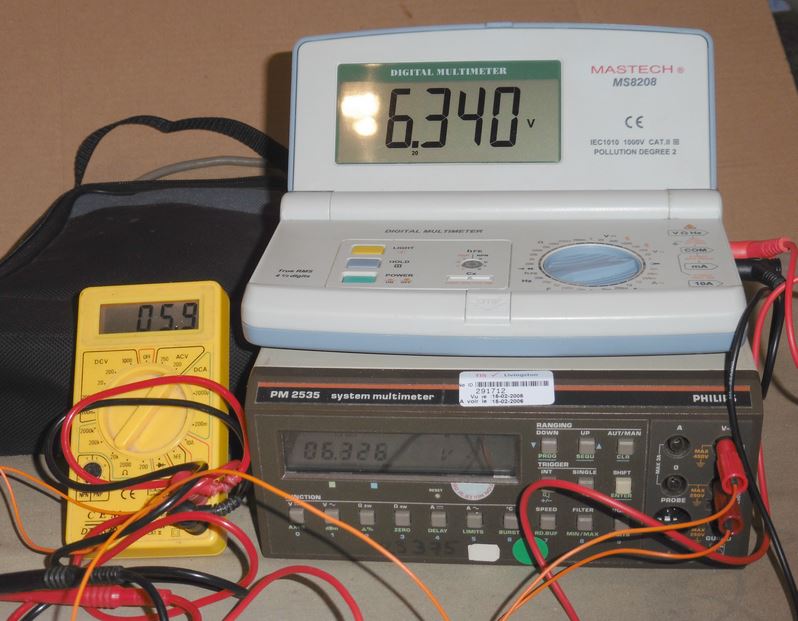 Ci-contre un petit comparatif entre 3 multimètres, un multimètre de table Philips PM2535, un Mastech MS8208 qui présente quelques vrais calibres AC, et un bas de gamme type grande surface (DT830B). Ils sont reliés tous les 3 au secondaire d'un transfo alimenté par un variac.