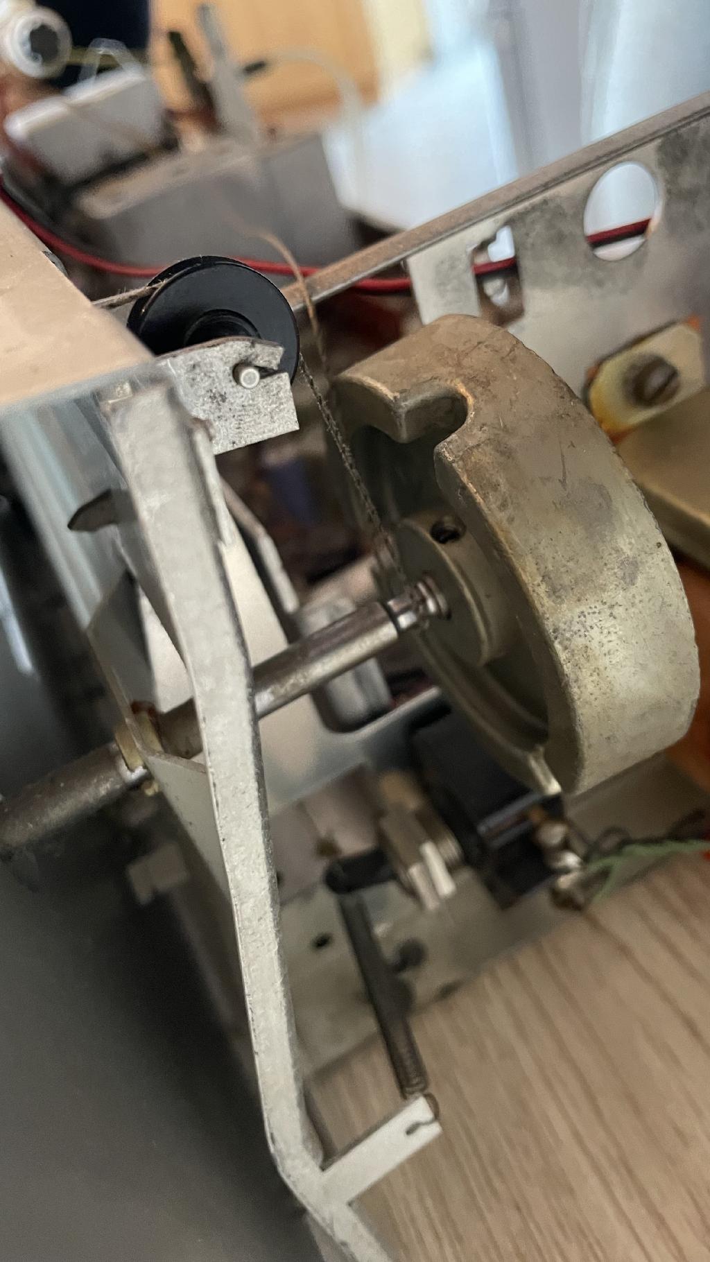 Le câble de la radio : Celui qui fait tourner la poulie pour changer la fréquence est défait, et je ne sais pas comment le remettre en place. Je ne connais pas la position de base des deux poulies aux extrémités. Est-ce que quelqu’un aurait des photos ou un schéma pour m’aider à refaire le montage correctement ?