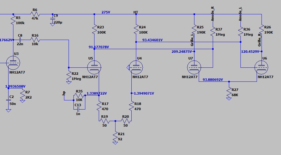 Je propose de passer par une simulation SPICE pour comprendre le fonctionnement car effectivement c'est pas du classique. Pourriez-vous nous donner les références des tubes et la tension d'alim HT ? Je suppose que ça doit être quelque chose de l'ordre de 300V mais je voudrais être sûr.