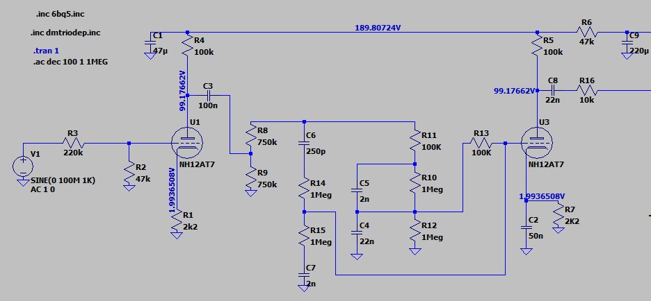 Pour la simulation SPICE, j'ai remplacé les ECC85 par des ECC81 dont les caractéristiques DC sont proches. Ce montage fonctionne plutôt bien. Je me suis permis d'inventer des valeurs pour les composants pour lesquels elles n'étaient pas indiquées. Le potentiomètres sont remplacés par des résistances fixes correspondant à la position à mi-course.