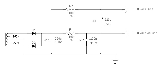 Et si les condos tiennent la tension, il vaudra peut-être mieux redresser avec des diodes; tu n'en auras que plus de sauce. De plus la non utilisation d'un tube redresseur (pas de consommation filament) soulagera la consommation ou puissance totale fournie par le transfo.![[:Hi:]](s12.gif)