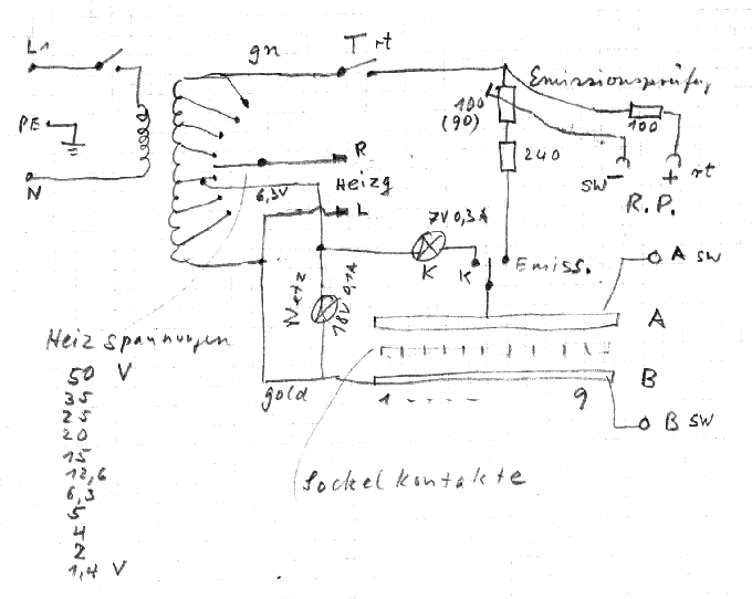 Ce testeur de lampes les fait fonctionner en redresseur (diode). Vous pouvez utiliser n'importe quel voltmètre ou même oscilloscope. Le moins pire, c'est d'avoir une lampe à 100% de chaque modèle et de comparer le résultat avec les lampes à tester. ![[:Hi:]](s12.gif)