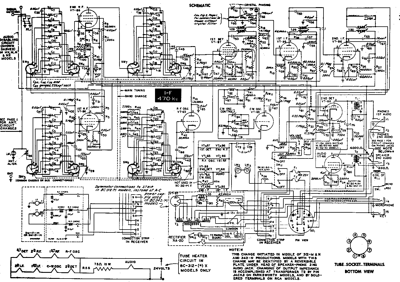 Bonsoir, pour Jean-Roland, si l'appareil possède un filtre à quartz -à la place du rhéostat éclairage cadran- et a ses inscriptions en français- il doit s'agir d'une série us, reconditionnée par LMT dans les années 60. A l'époque, les postes étaient mis en pièces et recablés, même les transfos FI étaient rebobinés ! Ensuite, le poste recablé était tropicalisé. Ces 342 ont été utilisés par le service des trans. Le service des Domaines a exigé l'arrachage de la plaque signalétique avant la revente du matériel. Le reconditionnement de ces appareils a coûté, à cette époque, 3000 frs (mon salaire mensuel était de 300 frs !!!).