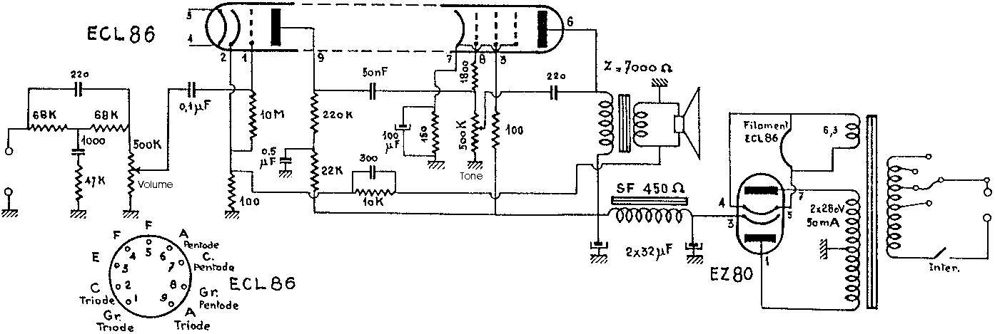 Un ami m'a demandé de lui faire, pour son petit PC, un truc avec des lampes qui pourrait remplacer ses petits HP en plastoque. J'avais pensé à un ampli composé de deux ECL86, pour faire simple, et j'ai trouvé le schéma que j'ai joint.